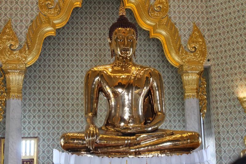 Sonunda Wat Traimit’e geliyoruz. Bu tapınakta dünyanın en büyük saf altın heykeli yer alıyor. 700 yaşında, 3 metre boyunda ve 5,5 ton ağırlığındaki heykele paha biçilemiyor. Heykelin kendisi kadar hikayesi de etkileyici, heykel, geçmişte Ayutthaya’da Burmalı istilacılardan korunabilmek için çimentoyla kaplanmış ve yıllar boyunca hep çimentodan olduğu sanılmış. Ta ki bundan 40 yıl önce taşıma esnasında vinçten düşüp çimentonun çatlaması ile çimentonun altındaki hazine ortaya çıkmış.