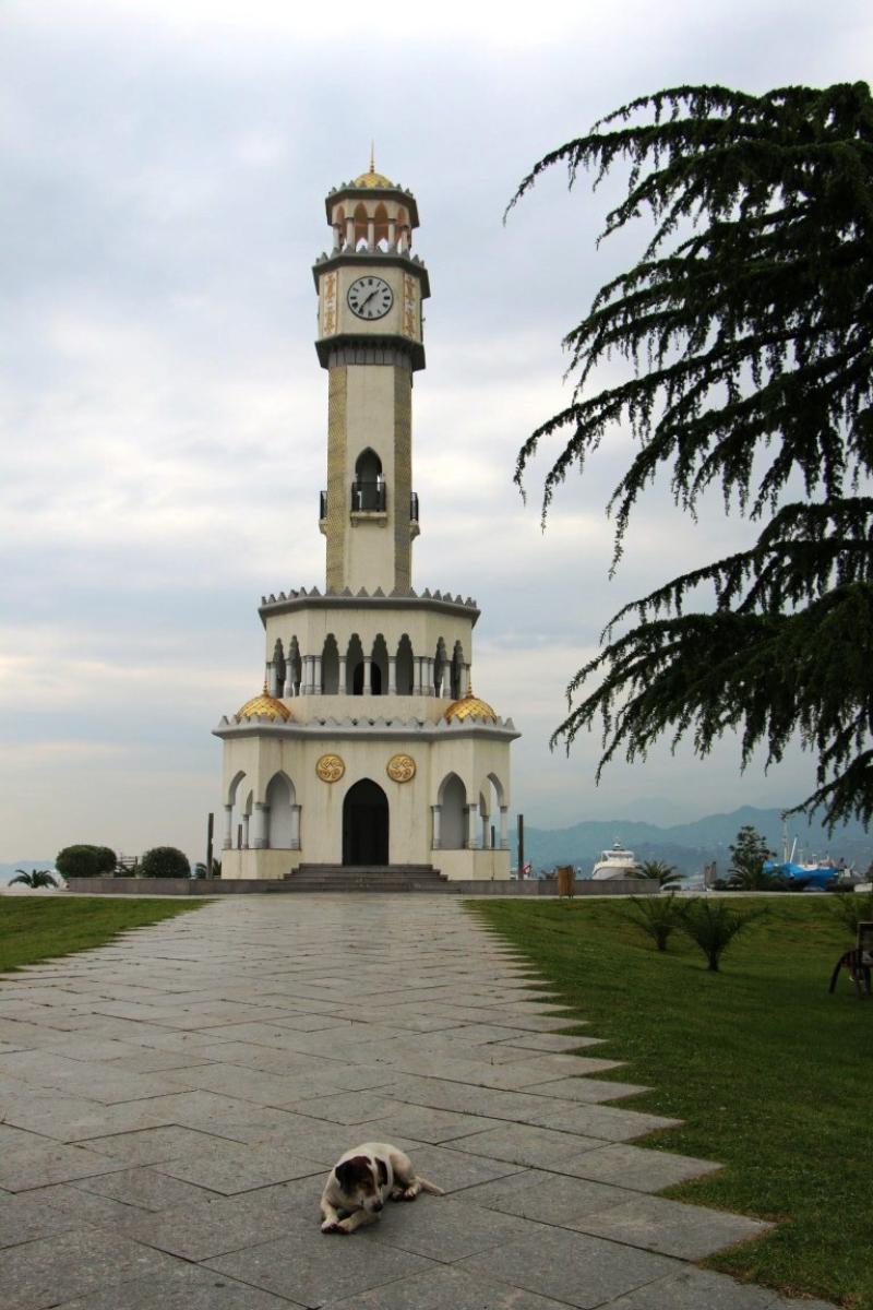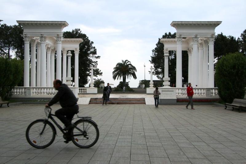 Etraf tertemiz. Her akşam belirli saatlerde belediye görevlileri temizlik yapıyorlarmış. Karadeniz’e sırtımızı verip tekrar kentin içine doğru yürürken 1934 senesine tarihlenen Colonnades’i görüyoruz. Buradaki sütunlar 1934 senesinde Batumlu Doktor Ivana Mtchedlidze tarafından İtalya Sorrento’dan buraya getirilmiş. Sütunlar dikilerek Karadeniz’e giden yolda bu şekilde bir kapı yapılmış.