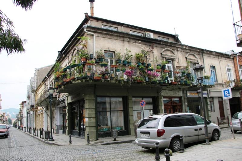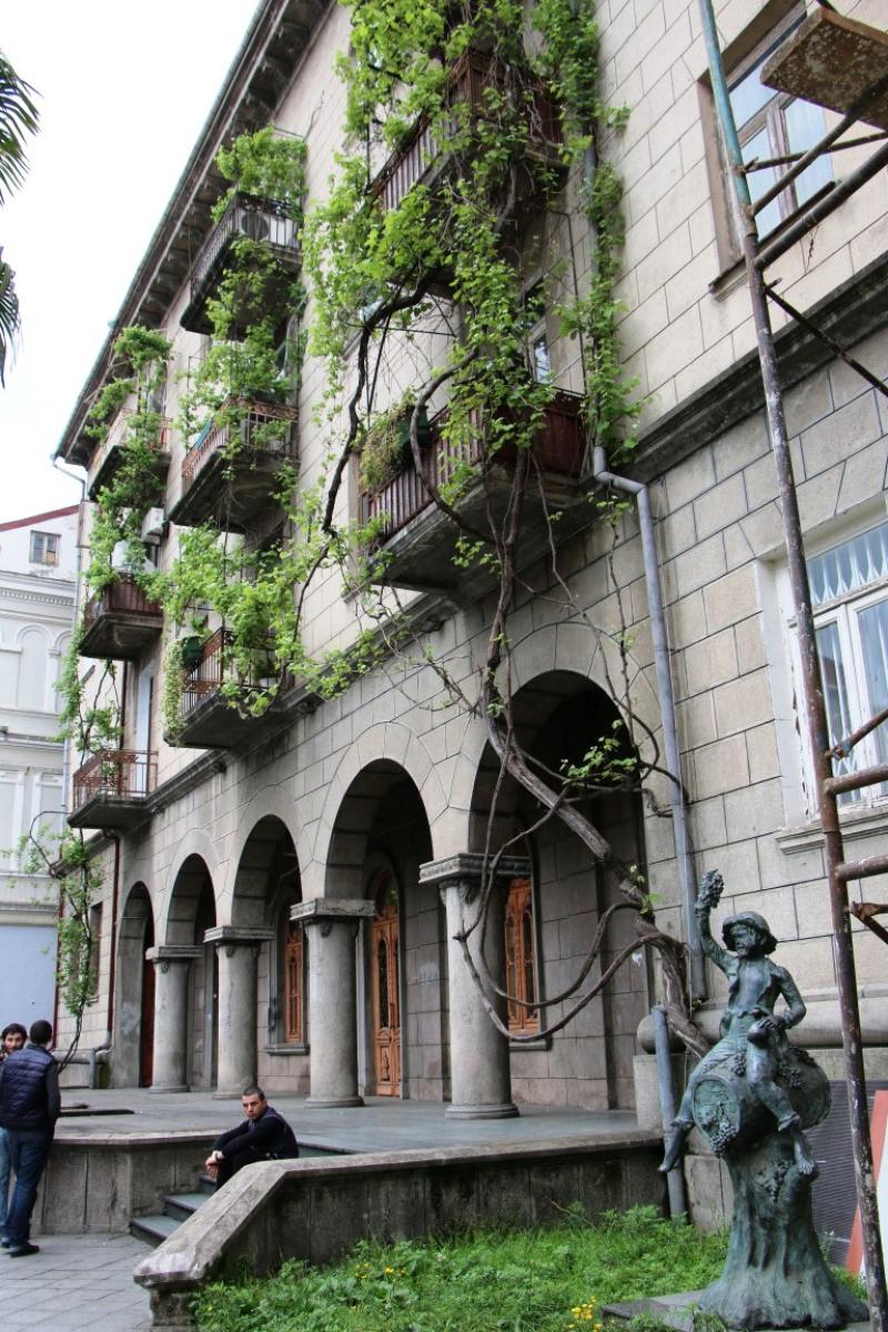 Hemen çıktığımız cadde ise Rustavi Caddesi. Zaten tüm Gürcü kentlerinde kentin ana caddesinin adı Rustavi. 2 şerit gidiş 2 şerit gelişten oluşan bu cadde oldukça keyifli. Cadde üzerinde ise farklı sanatsal çalışmaların uygulandığı bir takım binalar görüyoruz. Mesela bu bina aslında bir surat.