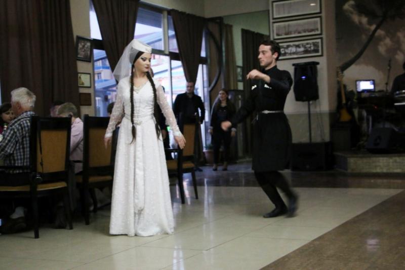 Akşam yemek ve Gürcü dansları performanslarını izledik. Kafkas oyunlarına çok benzettim ben. İlk çıkan dansçı çiftin kadını beyaz elbise, erkeği siyah elbise içinde. Ama bu gelin damat temsili anlamına gelmiyor. Bu kıyafet Batum bölgesindeki yerel kıyafet.