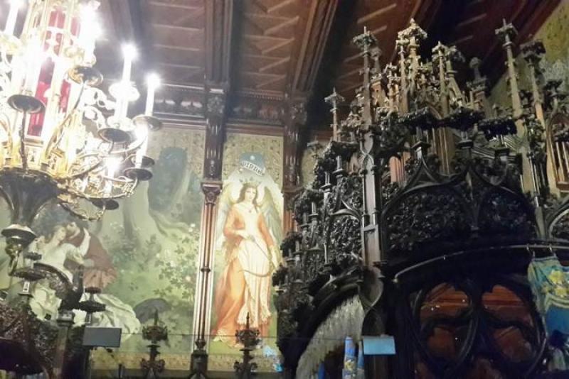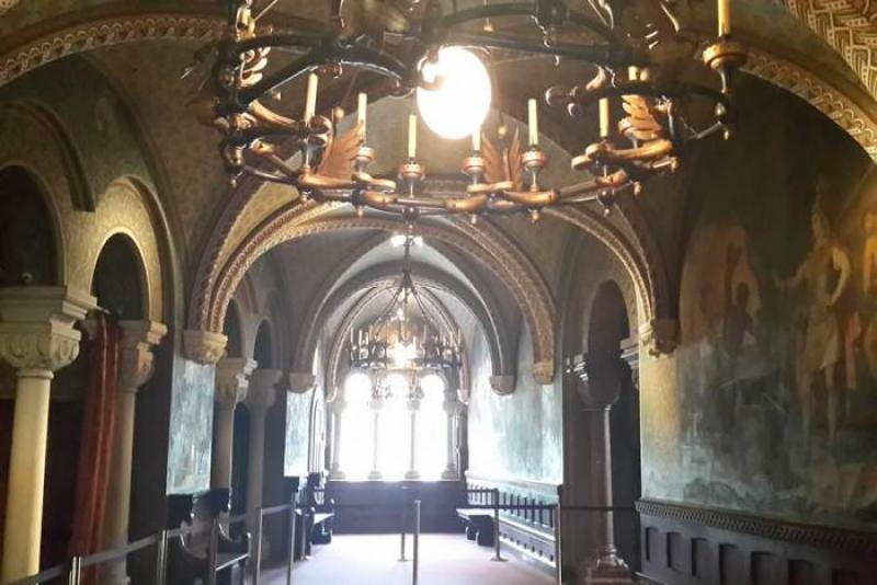 Giriş için, numaramızın olduğu grubun girmesini bekliyoruz. Şatoya rehbersiz girişi kabul etmiyorlar. Kalenin içinde fotoğraf çekimi de yasak! Sadece ikamet edilen bölümlerin gezdirildiği rehberli turda, 1. katta hizmetlilerin bölümünden geçerek asla bitirilememiş 2. kata, sonra kralın özel bölümü olan 3. kata çıkıyoruz. 3. ve 4.kat; Ludwig'in ruhsal durumunu, yalnızlığını, yaratıcılığını, sanatsal tutkularını, kafasının karışıklığını hissettiren bölümler! Bana kasvet bastı bu şatonun içinde biraz! Dini inancına kuvvetle bağlı olan II. Ludwig'in karyolasının üstü, Notre-Dame Kilisesi’ni andıran gotik bir kilise maketi olarak tasarlanmış. Şatonun sadece 5 odası tamamlanabilmiş. Tepedeki, dairesel avize İstanbul'daki Bizanslı ustalar tarafından hazırlanmış bir Bizans tacı! Wagner'in Tannhauser operasından esinlenilerek yapılan geçit görevi gören yapay mağaralar ve kısa bir dehliz, görkemli taht salonu, çalışma odası, avizeler, heykeller ve yatak odasındaki yıldızlarla süslü tavanı...