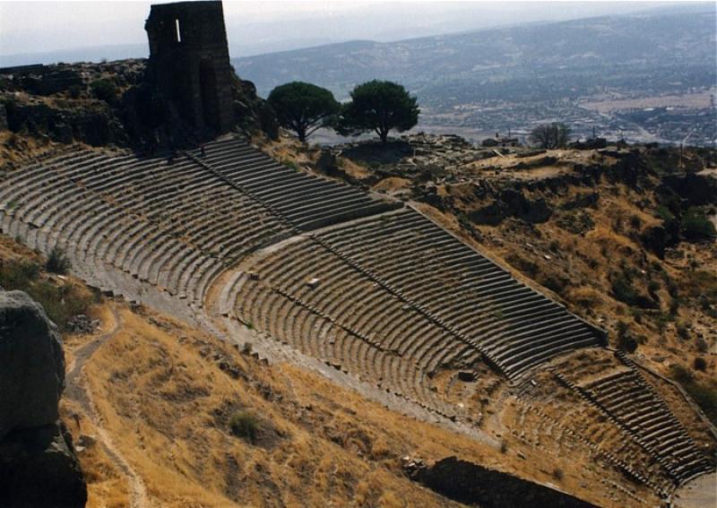 Akropolün batı yamacına konumlanan Helenistik tiyatro, 78 sıralı oturma yerinde 10 bin seyirci kapasitesine sahipti. Tiyatro terasının kuzey bölümünde, ötekilere göre daha iyi korunmuş Dionysos tapınağı, İon düzeninde ve 25 basamaklı bir podyum üzerinde yükseliyordu. II. yüzyılda yapılıp, III. yüzyılda yenilenen tapınak daha sonra bir yangından zarar görünce İmparator Caracalla döneminde onarıldı.