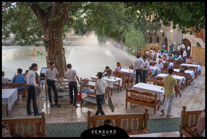 Sınırdan 100 km. içerdeki Bukhara’ya varınca, Lebi Havuz meydanında yemek molası verdik. Havuz etrafına kurulmuş restoranlar ve çarşısı ile Lebi Havuz meydanı bir hayli kalabalıktı. Açık havada Özbekçe canlı müziğin de icra edildiği salaş bir restorana kurulduk. Yol yorgunluğunun üzerine bir şeyler de içince uzun süre oturduğumuz yerden kalkamadık. Özbekistan’da da yemekler gelmeden önce hemen çay servisi yapılıyor. Genelde yeşil çay tüketilen bu bölgede çay bir kasenin içinde sunuluyor. Çaydan sonra gelen Özbek yemekleri, şaşlık ve yöreye özgü meşhur pilavları bir hayli lezzetli.