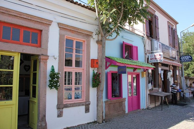 Otoparkın karşısındaki Çarşı Caddesi boyunca, sütunlu kemerli girişleri, kesme taş kat silme ve pencere söveleri, dikdörtgen büyük pencereleri ve dökme demir balkon korkulukları ile karakteristik Rum evlerinde hediyelik eşyalar satılıyor. Özellikle eski bir taş liman deposunun restore edilerek büyük bir pasaj halinde hediyelik eşya mağazasına dönüştürmüşler ki ilginizi çekmemesi mümkün değil.