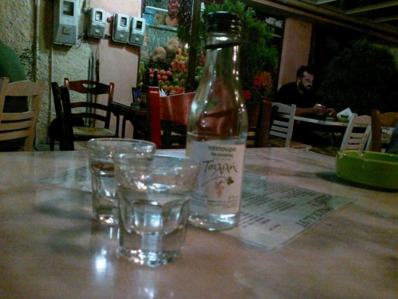 Ben meze ve rakı demiştim ama arkadaşım geleneksel bir içki olan tsipouro denememi önerdi. Tüm önerilere açık biri olarak tabi ki denedim. Tadı biraz acı rakı gibi daha çok Çeklerin tarçınlı içkilerine benziyor. Çok sevdiğim söylenemez. Rakıyı hatta uzoyu tercih ederim. Neyse efendim meze olarak 4 küçük tabakta domates, peynir ve patlıcan ezmesi geliyor bir de domuz salamı ama domuz istemiyorum derseniz salam yerine peynir veriyorlar. Bir de ekmek 1 Euro hatırlatayım.