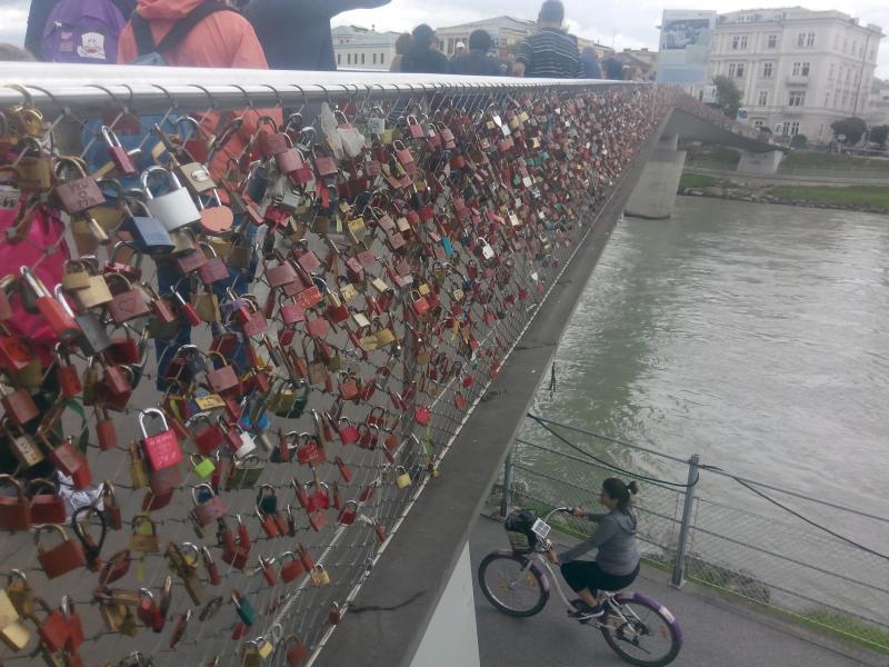 Salzach Nehri üzerindeki Makartsteg Köprüsü'nün üzeri pek çok Avrupa şehrinde olduğu gibi aşk kilitleriyle dolu. Köprünün korkulukları adeta çeyiz edasıyla kilitlerle doldurulmuş. Kilitlerin üzerindeki yazılardan iki Türk kardeşimizi tanımış olduk: İlker ve Nurgül. Tabii ki kim olduklarını bilmiyoruz. Floransa'da da ben kocaman bir kilide Hüseyin yazıp asmıştım. Şimdilik bir ses yok :)
