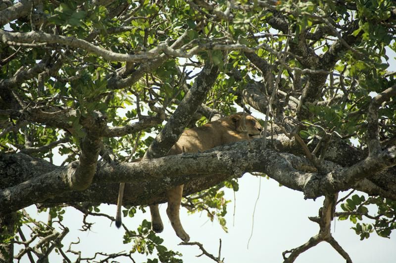 Rehberimiz Gift’le Serengeti'de yeni bir gün... Yola çıkar çıkmaz az ilerideki büyük bir ağacın yanında duruyor, biliyoruz ki bir hayvan var ama nerede? Ağacın dallarına bakın diyor, bir aslan ağaca yatmış uyuyor, harika bir görüntü.