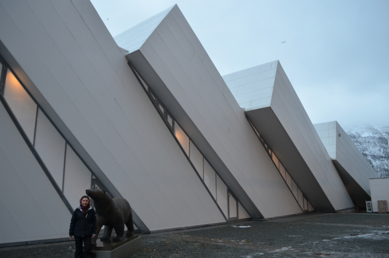 İkinci günümüzde yağmurlu bir gökyüzü karşılıyor bizi. Bu kötüye işaret çünkü akşam kuzey ışıkları turuna çıkacağız ve ışıkları görebilmemiz için ilk şart, açık bir gökyüzü. Bugün aslında Tromso fiyort turuna katılmayı planlamıştık; ancak tur şirketi bu turu hava muhalefeti nedeniyle iptal etti. O nedenle yine Tromso içinde vakit geçirmekten başka yapılacak bir şey yok.Odamızda yaptığımız uzun ve keyifli bir kahvaltının ardından sokaklara atıyoruz kendimizi. Tromso’nun etrafındaki dağları duman ve kar bürümüş, farklı bir dünyaya uyandık bugün. Çevrede yaptığımız gezintinin ardındanPolar Museum’da buluyoruz kendimizi. Önünde bir ayı heykeli olan, yatay ve üst üste binmiş bloklardan oluşmuş bir bina burası.