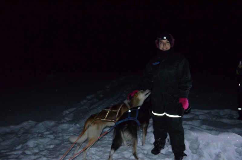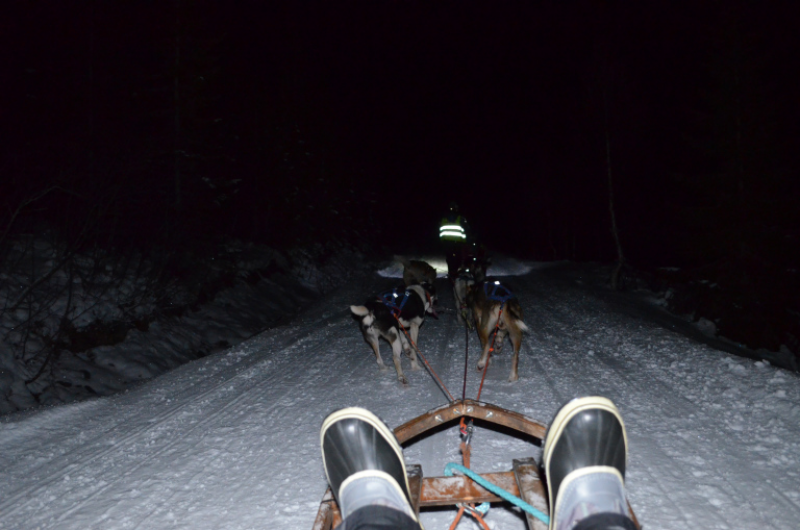 Rehberimizin verdiği giysi ve ayakkabıları giydikten sonra köpeklerin yanına gidiyoruz. Hepsi inanılmaz insan canlısı. Her kızakta bir sürücü ve bir de yolcu olmak üzere iki kişi bulunuyor. Her bir kızağı da toplam altı köpek çekiyor. Kızakta biri sert diğeri daha yumuşak olmak üzere iki tane fren bulunuyor. Eğer frenlere basmazsanız köpekleri durdurmak imkansız :) Ay ışığının altında Lyngen Alplerinin eteklerinde gezimize başlıyoruz. Etrafta kızakların sesleri haricinde ses yok, inanılmaz huzurlu bir ortam. Köpeklerin kısa yolları tercih ettikleri ve bu nedenle de kızağı taşların üzerinden zıplattıkları durumlar haricinde gayet keyifli bir yolculuk geçiriyoruz. Ne yazık ki kızak gezimiz sırasında kuzey ışıklarına rastlayamıyoruz.