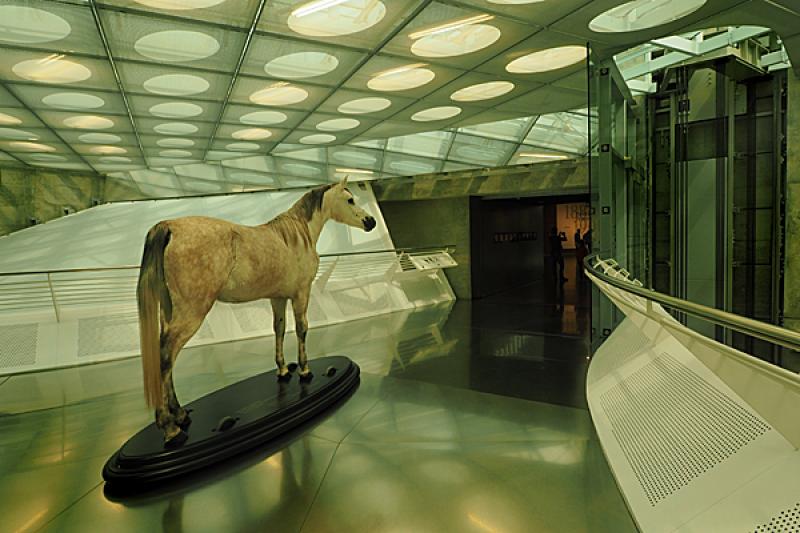 Sonra sağ tarafta bulunan vestiyer bölümüne sırt çantamı bırakmam gerekiyor; fotoğraf makinemi, küçük çantamı ve telefonumu alıp gerisini bırakıyorum (Müzeyi gezerken fotoğraf makinemin pili bitiyor, yedek pili çantada bıraktığım için telefonun şarjının bitmemesi için dua ederek fotoğraf çekiyorum. Bunca yıl fotoğrafla ilgilenen biri olarak hala bu kadar dikkatsiz olmamı takdir ediyorum!). Tekrar bilet bölümüne doğru geliyorum. Müze bu kattan başlamıyor. Bilet turnikelerinden geçip asansörlerden biri ile ferah bir şekilde 8. kata ulaşıyorum. Durmadan önce bir an at nalı şıkırtısı duyduğumu sanıyorum. Daha emin olamadan kapı açılıyor. Sergi salonuna doğru duran doldurulmuş beyaz bir at görüyorum, o tarafa doğru yürüyorum. Atın üzerinde durduğu kaidede bir yazı var: "I do believe in the horse. The automobile is no more than a transitory phenomenon" (Ben atlara inanıyorum. Otomobil, geçici bir hevesten başka bir şey değil…) Sözün sahibi İmparator 2. Wilhelm. Açıkçası imparator ileri görüşlü biri değilmiş!
