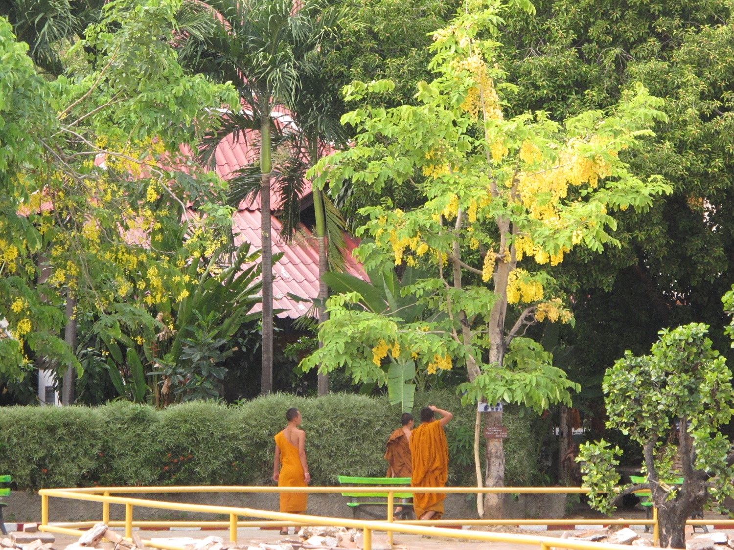 Chiang Mai şehir merkezinde birbirine yakın mesafelerde pek çok tapınak var. Hepsinin mimari stili birbirine benziyor. Bunlar da budist tapınakları ama Hindistan’da gördüklerimizden çok farklılar. Daha sonra tespit edeceğimiz gibi Güney Asya’nın her budist ülkesinde tapınakların kendine özgü ve farklı mimari tarzları ya da dekoratif detayları var. Chiang Mai’ın sade ama ince motiflerle ve detaylarla süslü güzelim tapınaklarının bahçelerinde ve şehir sokaklarında sık sık budist keşişlere rastlıyoruz. Öğrendiğimize göre Güney Asya ülkelerindeki erkeklerin pek çoğu hayatlarının en azından bir kaç senelik bölümünü budist keşiş olarak geçiriyorlar. Kimi bir kaç sene yaşıyor bu hayatı, sonra normal hayatına dönüyor. Kimi de hayatlarının geri kalanını budist keşiş olarak geçiriyor. Turuncu giysileri, kazınmış saçlarıyla Chiang Mai sokaklarının vazgeçilmez bir parçası bu keşişler.