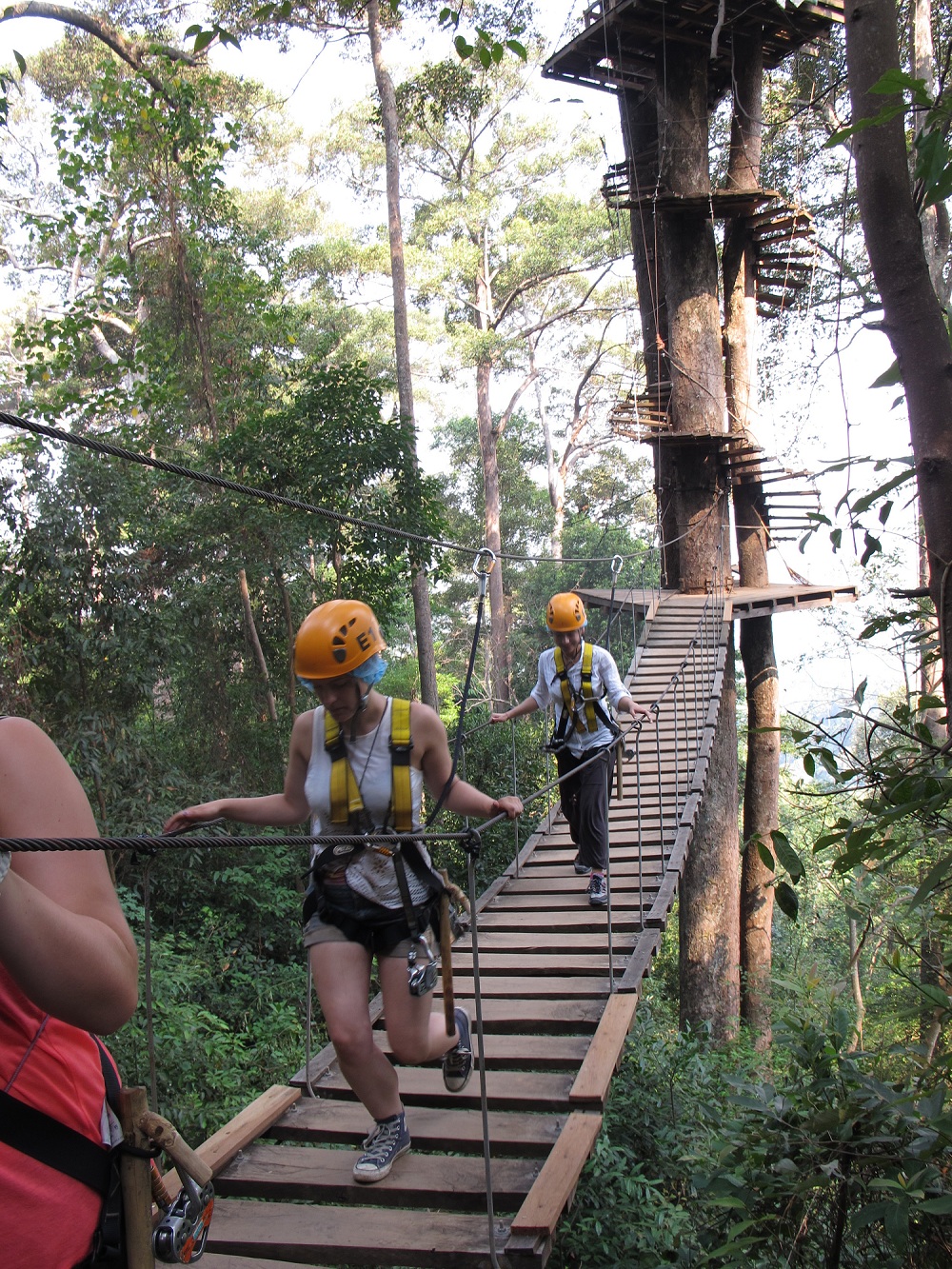 İkinci günümüze meşhur orman uçuşu aktivitesi ile başlıyoruz. Chiang Mai sokaklarındaki tüm seyahat acentalarının vitrinlerinde boy boy tanıtımları olan “Flight of the Gibbons”, “Jungle Flight” gibi isimlerle anılan orman uçuşu aktivitesi çok popüler. Biraz pahalı gerçi ama cidden adrenalini bol ve eğlenceli bir tecrübe, hem de Chiang Mai’da orman havasını da almış oluyorsunuz böylece. Biz bir kaç acenta dolaşıp fiyat aldıktan sonra biriyle anlaştık ve yarım günlük (ulaşım dahil 6 saat civarı sürüyor) versiyonuna kişi başı 54 Euro ödedik. Bu fiyata ulaşım, öğle yemeği ve hediye bir T-shirt dahil. Sabah erkenden tur görevlisi tarafından otelden arabayla alınıyor ve 45 dakika uzaklıktaki ormanlık alana gelince önce kostüm ve ekipmanları donanıyoruz. Orman uçuşu denilen bu aktivite kısaca şöyle gercekleşiyor: Ormanda büyükçe bir alanda çeşitli ağaçların arasına ipler gerilmiş ve bu iplerden kayarak ağaçtan ağaca uçuyor, böylece ormanı gezmiş oluyorsunuz. Bazen 50 metreyi bulan yüksekliklerden hızla kayarak karşı ağaca ulaşmak adrenalin seviyesi oldukça yüksek bir aktivite, yükseklik korkusu olanların bilmesinde fayda var. Aralarda da bir ağaçtan öbürüne yürümek gerektiğinde orman yürüyüşünü yapmış oluyorsunuz. Aktivite boyunca bize 4 kişilik profesyonel bir ekip eşlik ediyor, neyi nasıl yapmamız gerektiğini gösterip güvenliği sağlıyorlar. Bu aktivitenin bir de tam günlük olanı var, arada bazı şelaleler ziyaret ediliyor, daha fazla sayıda ağaç arasında uçuluyormuş. Aktiviteden önce fazla yemek yememenizi öneririz, midesi hassas olanlar için bu uçuşun kendisi zaten yeterince zorlayıcı bir aktivite, yemek işini uçuş sonrası gidilen ufak bir köy restoranındaki fiyata dahil öğle yemeği kısmına saklamak en güzeli.