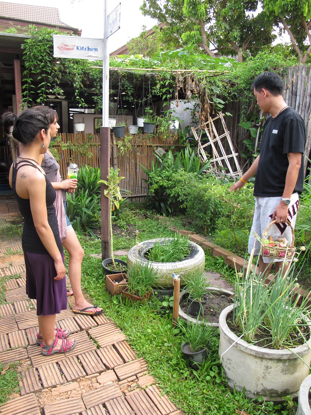 Yemek pişirmeye başlamadan önce kursun bahçesinden taze bitkiler topluyoruz.