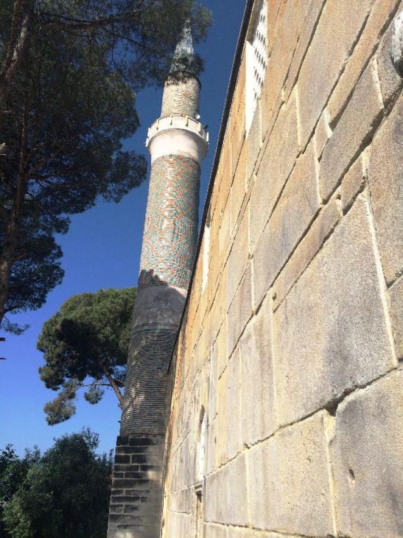 Birgi küçük bir köy, her yer yürüme mesafesinde. Merkezde yemyeşil, gölgelik bir meydan, bir kahve var ve bu meydan “Türkiye’nin En Güzel 10 Küçük Meydanı” listesinde 3. sırada. Bu şirin meydanda kahvenin tam karşısında bir cami bulunuyor. Dışarıdan baktığınızda bu camiyi farklı kılacak, dikkatinizi çekecek 2 özelliği var. Birincisi minaresi -Pek çok caminin minaresi arka sağ köşedeyken burada minare ön sağ köşede (büyük ihtimalle batı cephesinin hemen yakınında bulunan Aydınoğlutürbesi olması nedeniyle). Minare, kesme taşlardan inşa edilmiş kare bir kaide üzerine oturtulmuş silindirik gövdeli ve üzeri de kırmızı ve firuze renkli sırlı tuğlalardan yapılmış zikzaklı örgü ve baklava deseni ile günümüze kadar dayanmış ve muhteşem görünüyor.