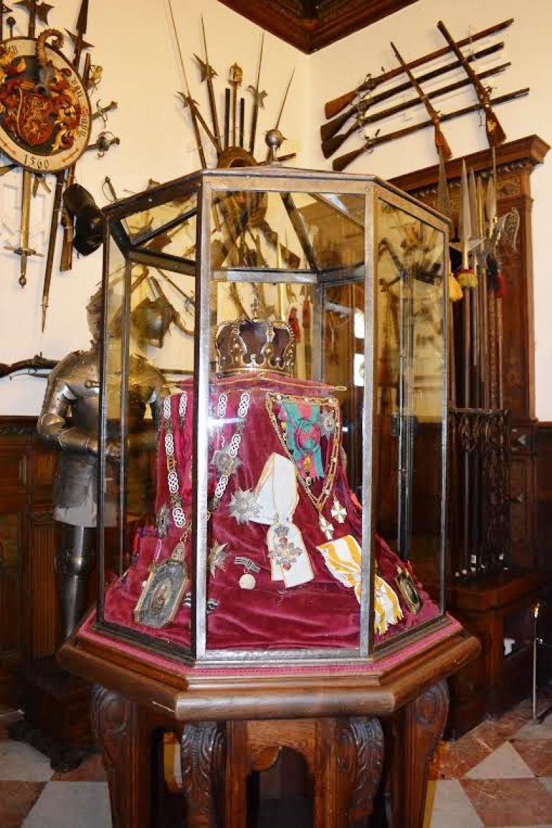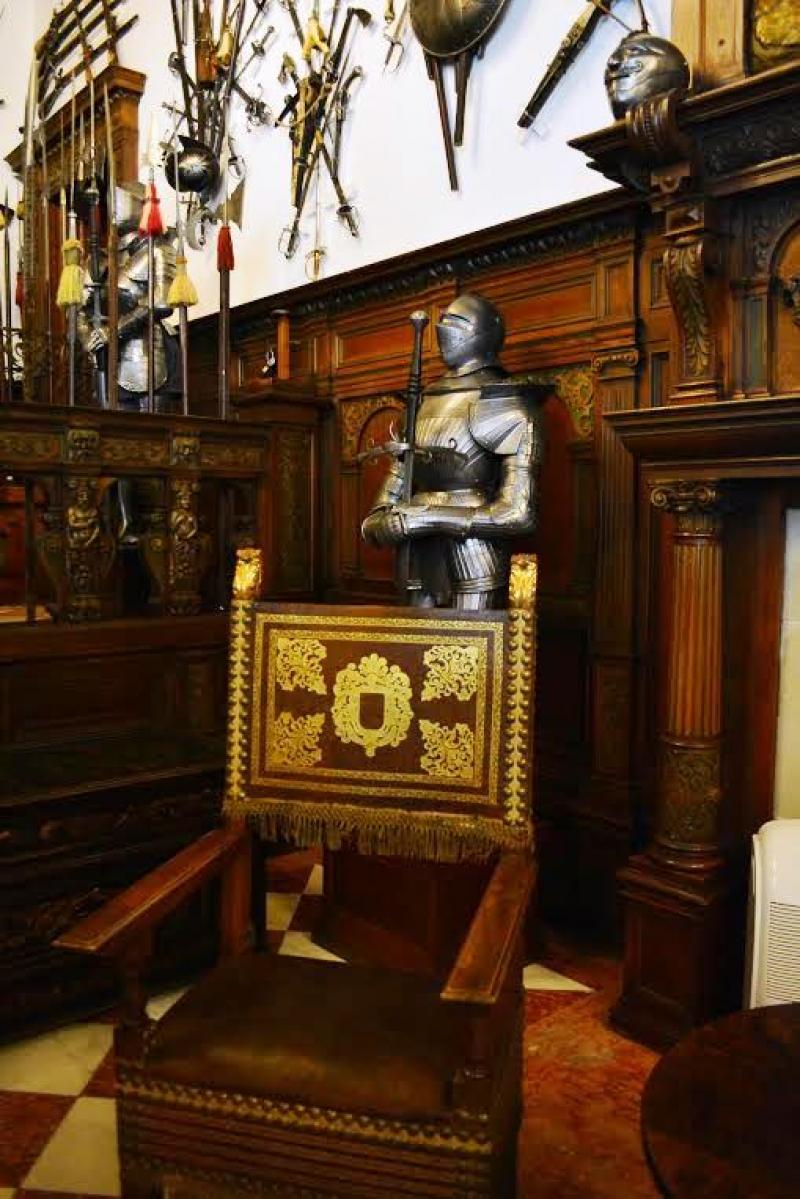 Kalenin bir diğer ilginç yeri de çeşitli ülkelerin savaş alanlarından, ordularından alınmış 4000 parçalık savaş ve avlanma silahlarının duvarlarda sergileniyor oluşu. Toplam 2000 adet tablo da kalenin duvarlarında yerini almış. Kalede tam 170 oda, 30 adet banyo varmış ama biz hepsini gezemedik. Bir de kralın vefat ettiği en üst kattaki yatak odasına çıkış için ayrıca bir ücret ödeniyormuş, maalesef bilet alımı sırasında bu ayrıntıyı gözden kaçırdığımız için en üst kata çıkamadık.