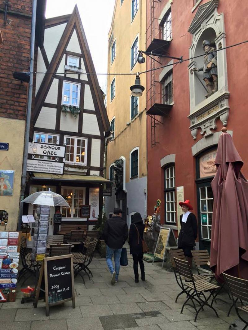 Şehrin diğer bir ünlü bölgesi ise Bottcherstrasse, burası savaş sonrası bir tüccar tarafından satın alınıp tamamen baştan inşa edilip böyle güzel bir yer olmuş. Burada bir sürü hediyelik eşyacı ve dükkanlar var. Son olarak Schnoor ise şehre 15. ve 16. yüzyıldan yadigar kalan yegane bir bölge. Burada da aynı şekilde, el işi hediyelik eşyalar ve küçük kafeler var.