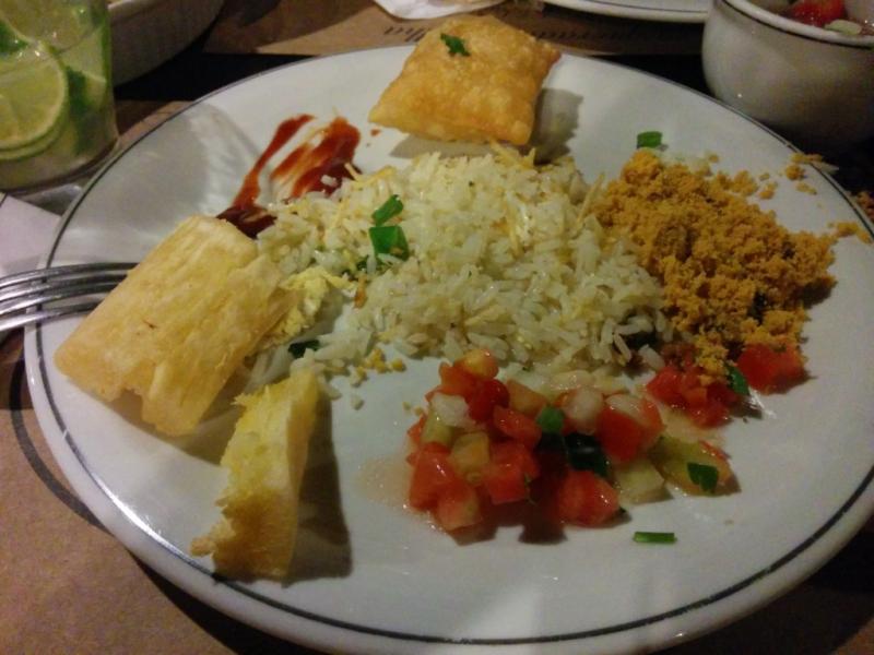 Ortada Arroz (Pirinç), soldan sağa mandioca frita (kızarmış cassava), pastel (içinde peynir ve et olan bir kızartılmış bir atıştırmalık), farofa (cassavanın çekilmiş toz halde olanı ki benim favorim bu, etle canavar oluyor =) ve vinagrete salatası. Bunlar daha başlangıç! Gelelim şimdi ana yemeğe...