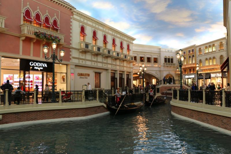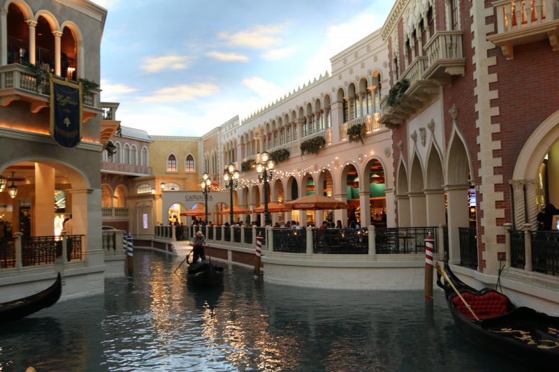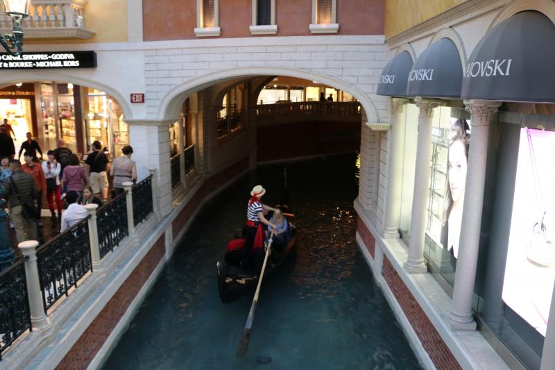Las Vegas otelleri lüks ve büyük olmalarıyla meşhur, tamam. Ama yine de odamıza girince bir şok da odanın büyüklüğü ve lüksü ile yaşıyoruz. Tabi ki ucuz bir otel değil ancak fiyatı yine de Türkiye’deki bir 5 yıldızlı otelin yarı fiyatı. Buna rağmen oda standartları oldukça yüksek. Otelin mevcut en küçük ve en ekonomik odası olmasına rağmen yaklaşık 65 metrekare genişliğindeki odamızda dev bir yatak, ayrı bir çalışma odası ve oldukça büyük bir banyo yer alıyor. Üzerimizi değiştirip çıktığımızda ise bu abartılı lüks ve boyut çılgınlığının burada durmadığını anlıyoruz. Lobinin bir üst katında Venedik’in ta kendisini buluyoruz. Bildiğiniz Venedik kanalları neredeyse gerçek boyutlarında bir kaç sokak şeklinde orada. Arya söyleyerek hizmet veren gondolcular sizi lüks markalar satan mağazaların yer aldığı binaların arasından geçirirken tavana baktığınızda yapay bir İtalya gökyüzü görüyorsunuz.