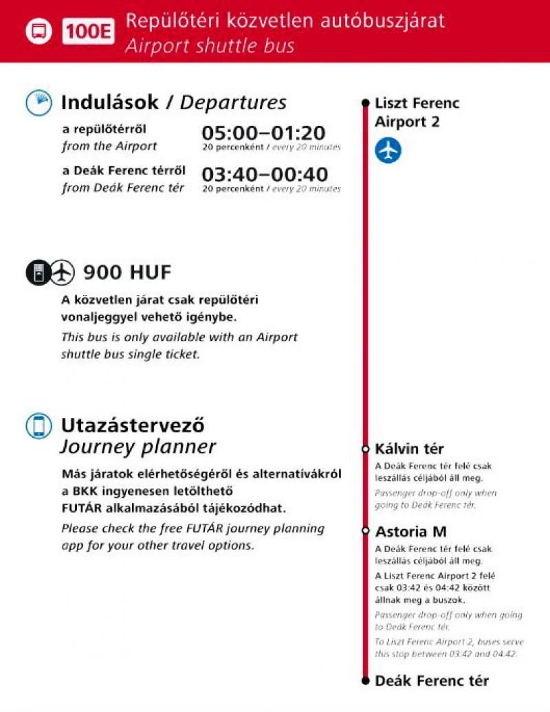Havalimanına ulaşım ise şehir merkezinden 900 HUF karşılığında 100E numaralı otobüs ile yapılıyor.