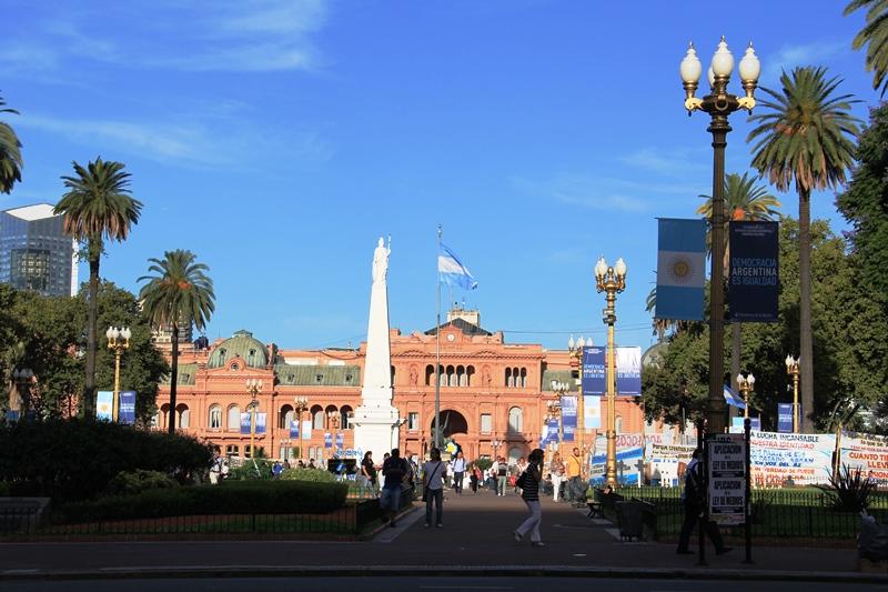 Meydandaki önemli yapılar; Buenos Aires Metropoliten Katedrali ve “Casa Rosada” yani Arjantin Devlet Başkanı’nın idari ikametgâhı Pembe Saray… Diğer bir ismi de Casa de Gabierno olan sarayın balkonundan Evita, Peron, General Galtieri ve hatta Maradona kalabalıkları selamlamış.