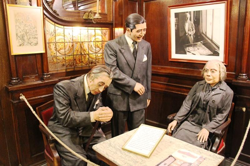 Cafe Tortoni'nin bir köşesinde yer alan balmumu heykeller… Kafenin ünlü müdavimleri; Borges, Gardel ve Şair Alfonsina Storni…