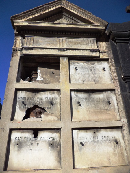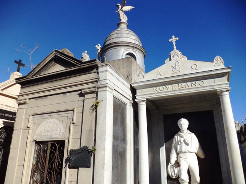Recoleta Mezarlığı’ndaki anıt mezarların çoğu bakımlı ama bazıları onarımsız kalmış; camları kırık, içlerine çöp atılmış. Heykeller Lola Mora ve Luis Perlotti gibi ünlü Arjantinli heykeltraşlar tarafından yapılmış.