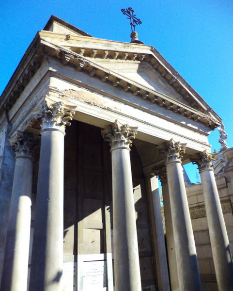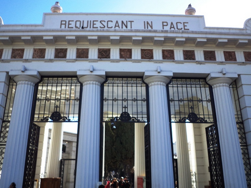 Recoleta Mezarlığı‘nın (Cementerio de la Recoleta) aşağıda gördüğünüz neo-klasik tarzı kapısının uzun Yunan Dor usulü sütunları var ve üzerinde bizim Zincirlikuyu Mezarlığı’nın girişindeki gibi HER CANLI ÖLÜMÜ TADACAKTIR yazıyor.