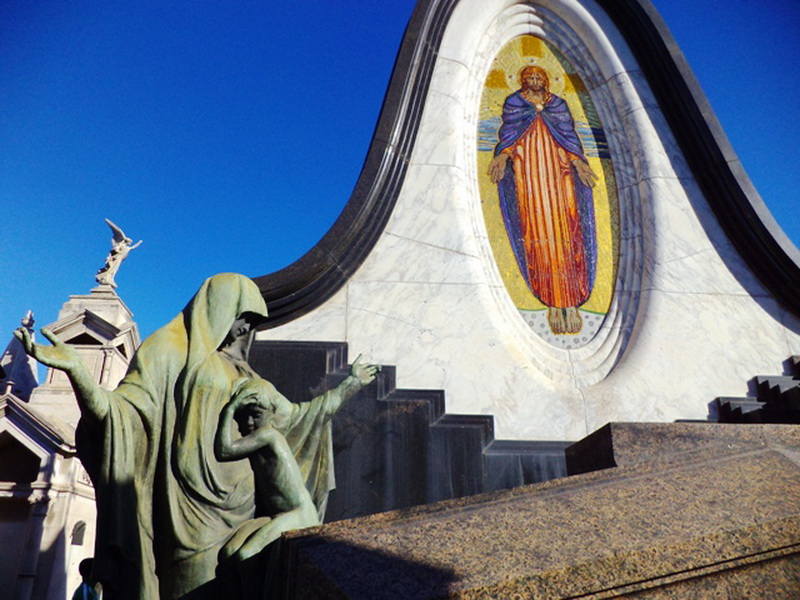 Dorrego-Ortiz Basualdo (1849-1920) ailesinin tapınak-mezarı, Recoleta Mezarlığı’ndaki sanırım en değerli eser. Güzel vitraylara, İtalyan işi heykellere ve sembolizmine sahip anıtın önünde Meryem Ana, yedi kollu bir şamdanı yakıyor. Yedi kollu şamdan, ruhsal aydınlanma ve ahiretteki ebedi kurtuluşu temsil ediyor (İslam’daki tevhid inancının vaat ettiği ödül: sonsuz cennet benzeri).