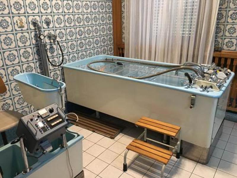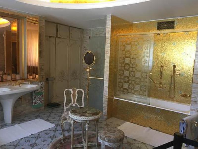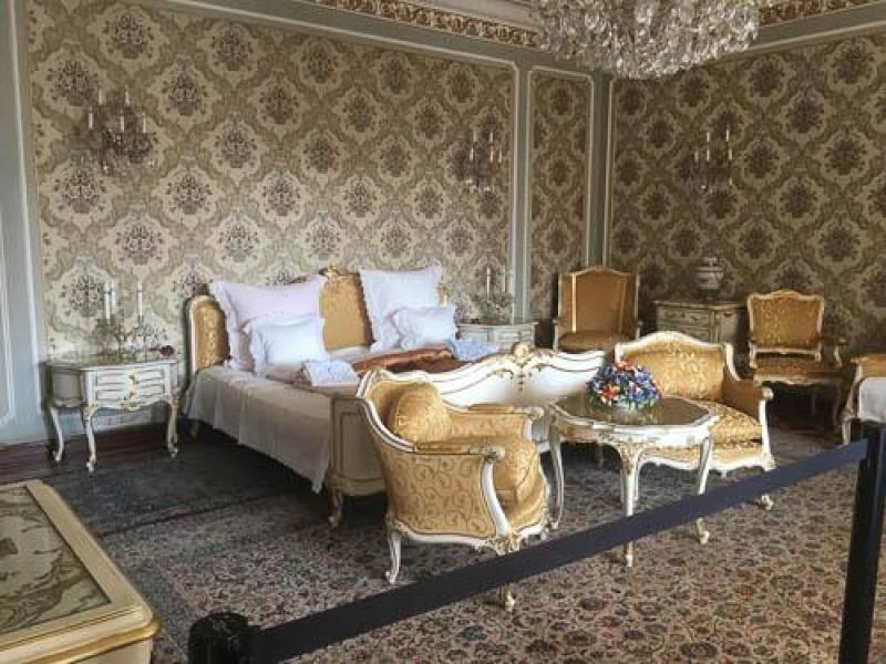 Sarayın içerisindeki yüzme havuzu yarı olimpik ölçülerde, aklınızda öyle mütevazı küvetten bozma bir havuz canlanmasın, ayrıca güzelliklerine ve sağlıklarına düşkünlükleriyle bilinen çiftin o döneme ait güzellik makinelerinin bulunduğu odalar görülmeye değer. Oksijen masajı için olan makine beni benden alıyor. Çiftin kendisine ait banyosu ise altın varaklar ile kaplanmış.
