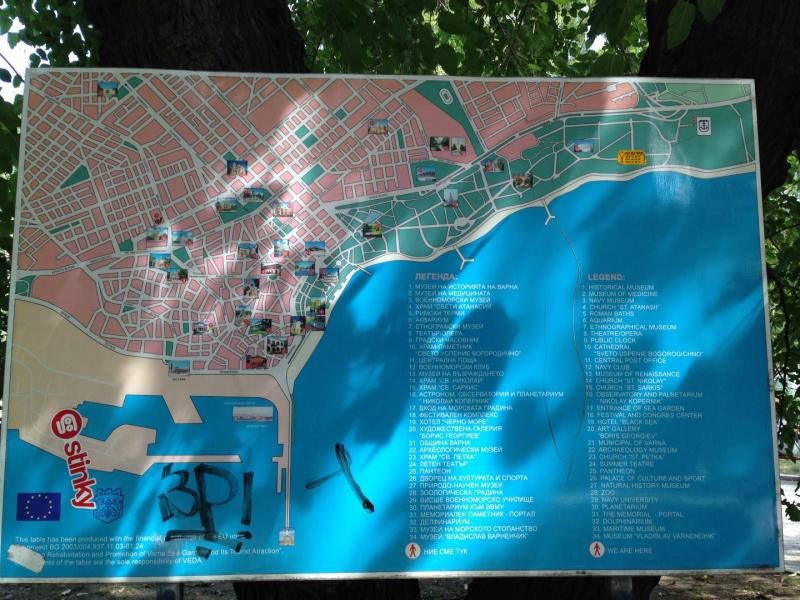Hatta kısaca burada yaşadığımız bir olaya da değinmek istiyorum:Akşam saatleri… Hava kararmış… Otelden çıkıp Varna’nın merkezine gitmeye karar verdik. Arabaya bindik. Parkın haritası elimde. Ufaktan kestirme bir yol görünüyor. Murat'a dedim ki “hadi gel buradan girelim, bak kestirme yol.” Murat diyor ki “Olmaz, parkın içi.” “Ama,” diyorum “bak araba geçecek yollar var, haritada da görünüyor” derken, biz girdik yola. Ama biraz ilerleyince yol daralmaya, sağımıza solumuza banklar çıkmaya başladı. Haliyle elini kolunu sallayan insanlar da. Ben tam bu sırada Murat’a “Haklısın ya, yanlış girdik galiba” dedim ama, bu kez Murat “Yok yok doğru. Bak arkamızda da araba var” derken, birden arkamızdaki araba selektör yakıp siren çalmaya başladı. Meğerse polismiş :) E haliyle durduk. Camı açtık. Polis bey Bulgarca anlatıyor, kızgınnn! Biz Türkçe... Neyse ki etraftan Türkçe bilen bir bey yaklaşıyor ve çevirmenlik yapmaya başlıyor.