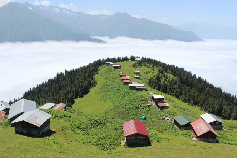 Bulut denizini gerçek bir deniz gibi düşünürsek solumuzda yürümekle birkaç saatlik mesafede denizin kıyısında dar bir sırtta uzanan başka bir yaylada evlerin çatıları batıya doğru ağır ağır alçalan güneşin ışıkları ile parıldıyordu. Burası Hazindağ Yaylası. Bu yaylanın bulunduğu dağ sırasında derin bir vadiyi aştıktan sonra ise vadinin çam ağaçlarıyla kaplı orman örtüsünün seyrekleştiği bir noktada Amlakit Yaylası görülüyor. Kaçkar Dağları’nın eteklerinden kaynaklanıp vadi boyunca birkaç dala ayrılıp akan dere akşam güneşi ile bembeyaz ışıldıyor. Dere vadinin bulutların altında kalan kısmında devam edip, Kaçkar Zirvesi eteklerinden doğan Fırtına deresi ile birleşiyor. Birleştikleri nokta dere kenarında derin vadide yolun kenarı boyunca sıralanmış birkaç evden ibaret olan Çamlıhemşin. Fırtına deresi daha sonra Pazar ile Ardeşen’in arasında bir yerden Karadeniz’e dökülüyor.