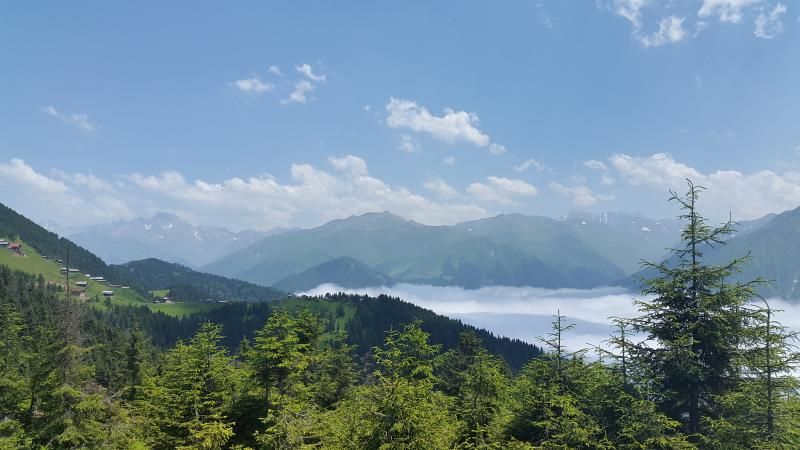 Seyhan, Güney batıda Çat Vadisi’nin batı yamaçlarında yeşili açık gökyüzünün mavisi ile karışan uzak sıradağların bulut denizine nazır sırtlarında Gito Yaylası’nı gösteriyor bize parmağıyla. Bu arada serin rüzgar, benim ara verdiğim kitabı yapraklarını uçuşturarak okumaya devam ediyor. Dağların tepelerinde yazın dahi erimeyen benek benek kar örtüleri görülüyor. Doğuda yeşil ve mavinin karışımı tepelerin ardında ise Kaçkarlar’ın grileşmiş yüksek noktaları mavi gökyüzüne doğru sivri zirvelerini uzatıyor. Samistal’in bulunduğu vadinin solundaki tepelerin ardından Kaçkar Dağı, daha solumuzda ise Beştaş Tepesi’nin arkasında, Kavrun Vadisi’nin ötesinde Kemerli Kaçkar Dağı ufukta gökyüzünden önceki en yüksek noktalar olarak görülüyor.