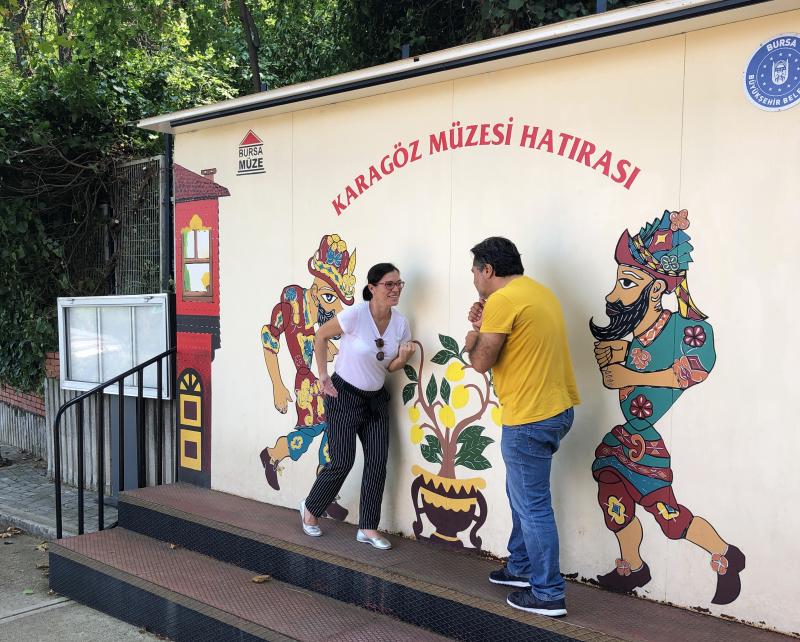 Karagöz Müzesi’nin hemen karşısında Bursa’nın kültürel simgesi olan Karagöz Anıtı yer alıyor. Bursa’nın en eski mezarlığı olduğu düşünülen Yoğurtlu Baba Dergahı’nda yer alan kabrin Karagöz’e ait olduğu düşünülüyor. Bu nedenle de 1950’de burası anıt mezara dönüştürülerek arkasına Şeyh Küsteri, Karagöz ve Hacivat’ı temsilen üç mezar taşı eklenmiş. Buraya da Karagöz ve Hacivat’ın çiniden rölyefleri işlenmiş. Aslında eski trafo binası 1997’de ilk olarak sanat merkezine dönüştürülmüş, daha sonra anıtın karşısında yer aldığı için Karagöz Müzesi olarak yeniden düzenlenmiş.Müze girişinde çok güzel bir hatıra panosu var. Biz tabii vakit kaybetmeden hemen burada birer fotoğraf çektirip müzeye doğru ilerliyoruz.