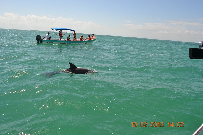 Sırada tekne turumuz var, oldukça süratli teknemizle hızla ilerliyor ve ellerinde fotoğraf makineleri denizi gözleyen turist teknelerinin bulunduğu bir yere geliyoruz. Yunus balıkları bizi fazla bekletmiyor ve teknemizin etrafında dolaşmaya başlıyor ve ara sıra da su yüzeyine çıkarak kendilerini gösteriyorlar.