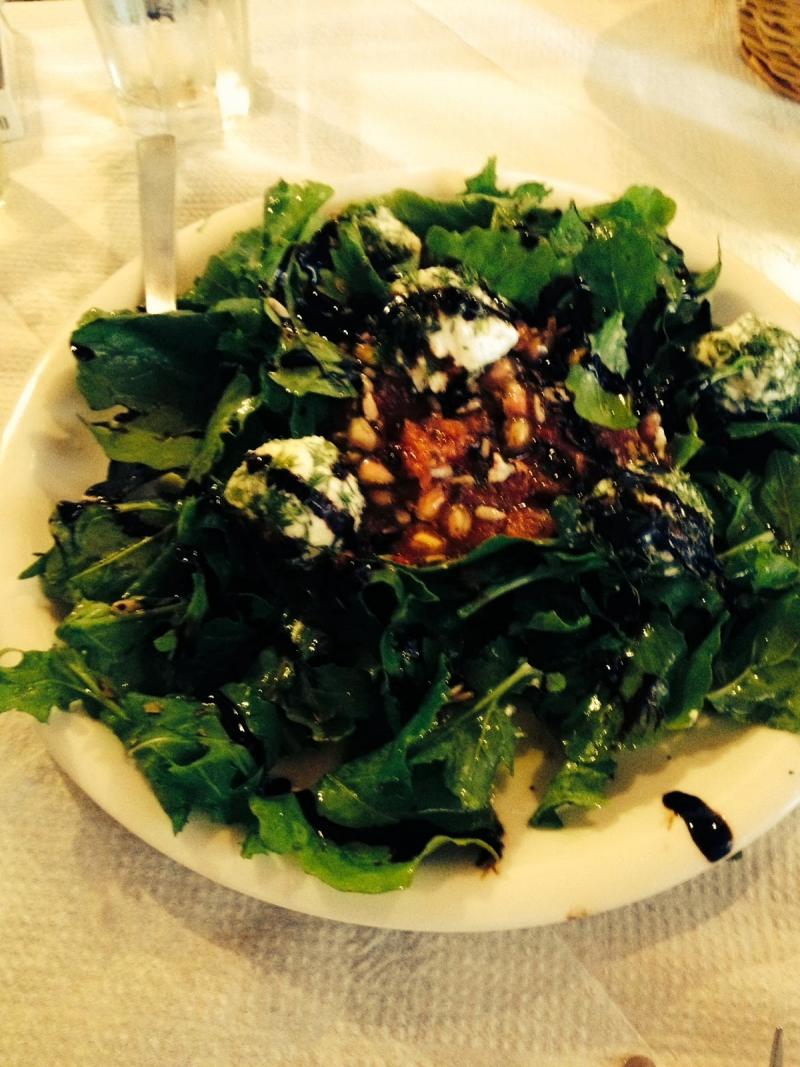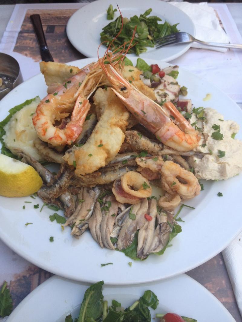 Bizim evimiz antik stadyumun hemen yanında. Evde hemen birer Mythos ile başladık. Sevgilim ben evde dinlenirken, her zamanki gibi etrafı keşfetmeye gitti. Döndüğünde gözleri yine fal taşı gibi açılmış, “sevgilim süper lokantalar buldum! Hadi kalk" dedi. Hemen evin üst tarafında terası asma yapraklı olan lokantaya geldik. Mezeler, hemen uzo vs. derken masayı donattık. Her şey harika lezzetli değildi, hayal kırıklığı da olmadı ama sıradandı yani... Daha iyilerini yedik 4 gün boyunca.