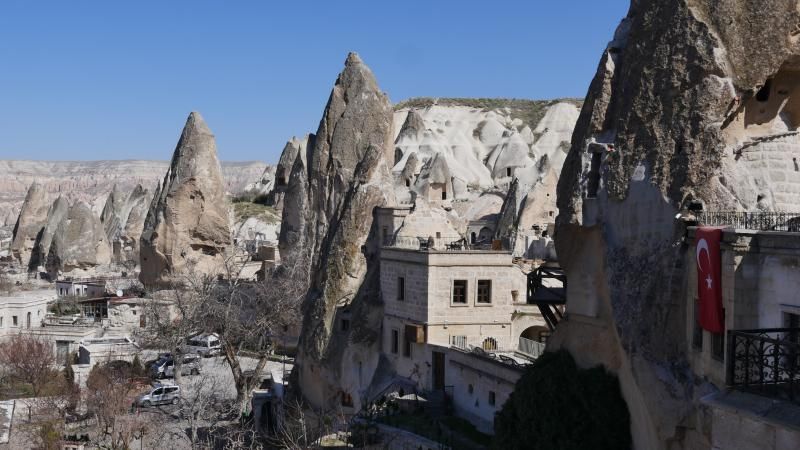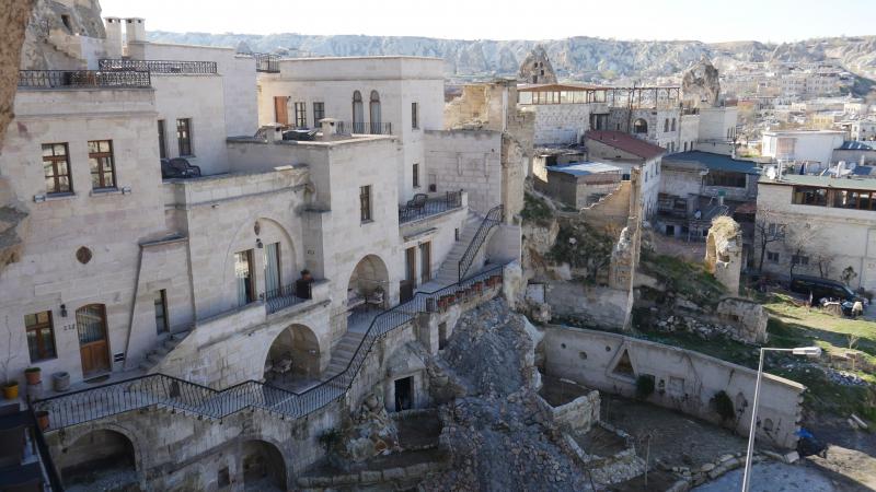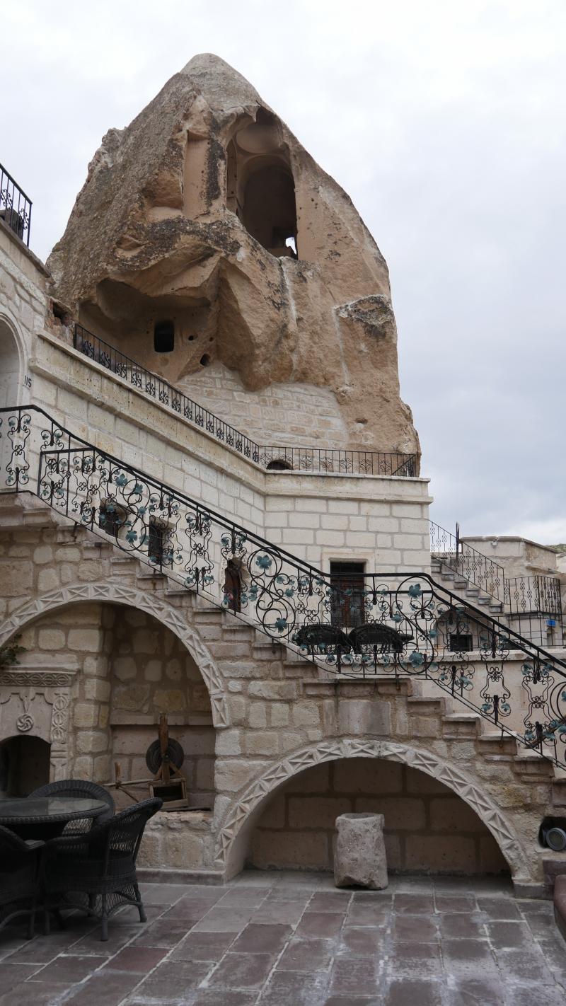 Bu kez bizim konakladığımız otel Cappadocia Cave Suites. Göreme’nin tam merkezinde müthiş manzaraya sahip olan otel bünyesinde 3 peri bacası barındırıyor. Bu özelliği ile bölgedeki tek otel olan Cappadocia Cave Suites, bir kısmı peri bacalarının içerisinde yer alan toplam 36 odaya sahip bir tesis.