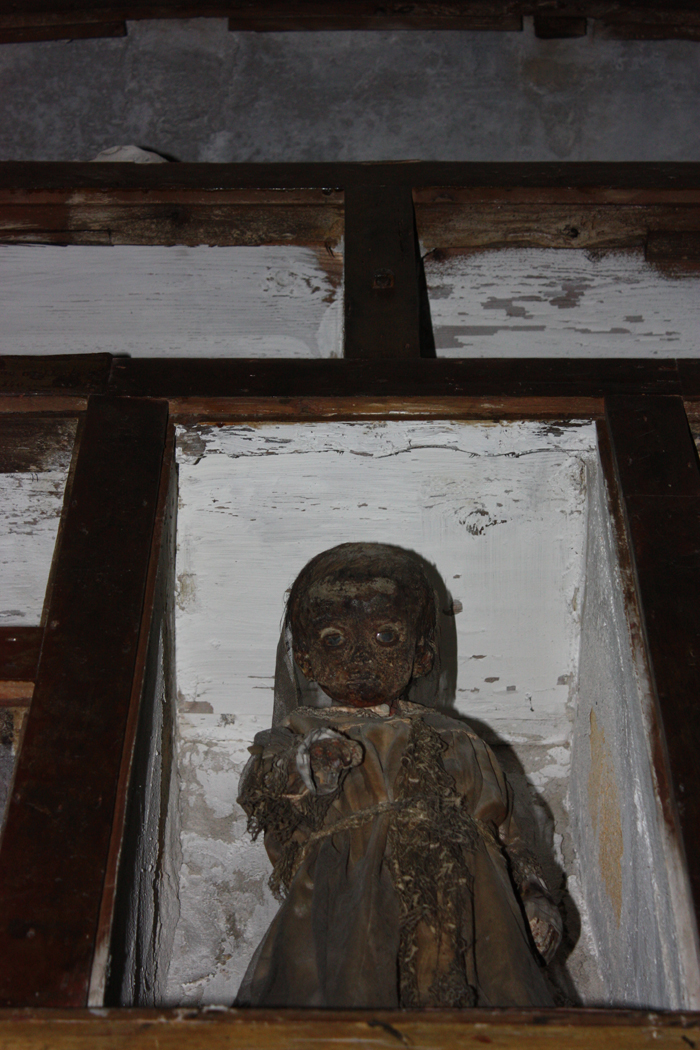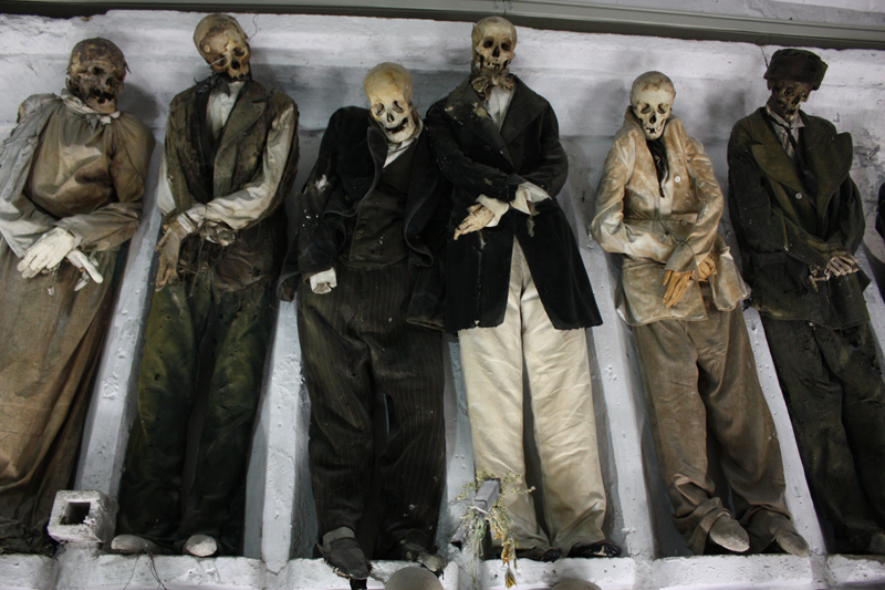 Önce merdivenlerden aşağıya iniyoruz. Loş, soğuk ve sevimsiz bir girişi var. Birbirine dik açılarla açılan uzun koridorların iki yanında boyun ve ayaklarından duvara asılmış olarak sergilenen çeşitli yaşlarda mumyalar bulunuyor. Bu şekilde asılmış yüzlerce binlerce kurutulmuş ölü bedenleri görüyoruz.