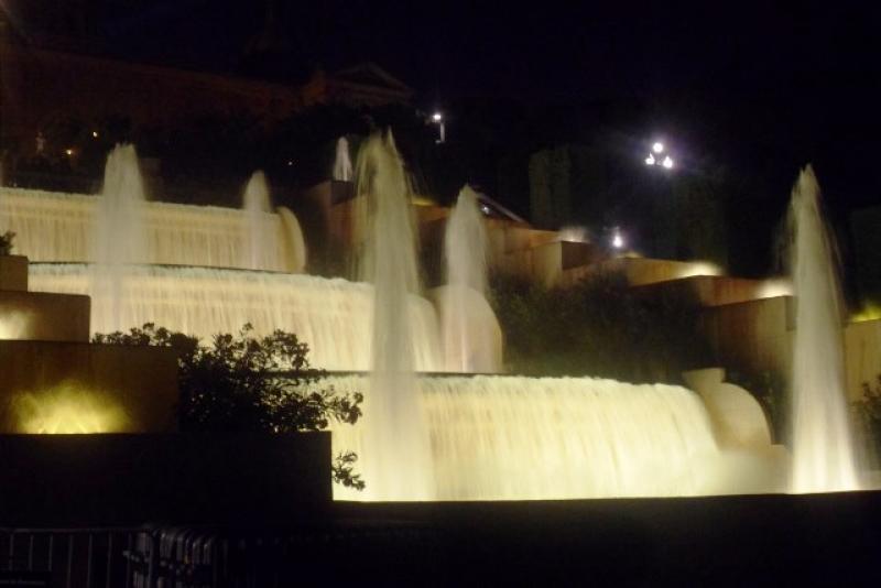 Müzenin önünde ve çevresinde gezilmesi gereken havuzlar ve yüksek merdivenler var ki her akşam bu havuzlarda müzik ile koordineli su dansı gösterisi varmış. Saat 20.00’ de başlıyor ve biz bunu kaçırmak istemediğimizden, müzenin önündeki merdivenlerde müze gezisi sonunda yorgunluğumuzu atmaya karar verdik. İyi ki öyle yapmışız… Merdivenlerde zaman içerisinde 100 kişi falan oturmaya başladı. Tabii bu kadar kalabalığa, uyanık seyyar İspanyollar duyarsız kalır mı? Müzik çalanlar mı, yoksa hokkabazlık yapanlar mı arasınız… Yoksa şarkı söyleyenler mi? Bira ve çerez de ister misiniz bunları seyrederken? Seyyar satıcı çocuklarda buz gibi kutu bira 2 €. 2 bira içtim bütün 5 € verdim. Bozdurup getireyim dedi, gitti. Bakalım bizim para üstü gelecek mi? Biz bu arada etrafı seyrediyoruz ve müze tabii ki bu arada kapandı. Sonra girişine kokteyl masaları konup arkamızda zengin bir kokteylli nişan töreni yapılmaz mı! Buyurun bakalım eğlenceye… Evet, saatler ilerledikçe su gösterisini seyredecek kalabalık aşağıda ve etrafımızda çoğaldı. Demek ki gösteri saati yaklaştı. Bu arada para üstünü merak edenlere bildireyim. Para üstü geldi valla. Helal olsun bu İspanyol’a diyorum. Onu da müzisyene verdim, tamam oldu.
