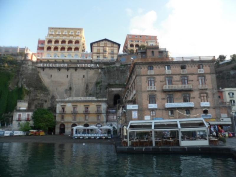 Gemimiz Messina’dan ayrıldıktan sonra Napoli’ye doğru yol alıyor. Sabahın erken saatlerinde Napoli limanına demirlediğimizde programımızda bu sefer Sorrento’ya tren ile gitmek var. Napoli istasyonuna 7 Euro taksi ücreti ödeyerek vardık. 8 Euro’ya gidiş-dönüş tren biletlerimizi aldık ve yarım saatlik bekleyişten sonra trenimize bindik. Hemen bir yer bulma ve insanları inceleme faslından sonra etrafımıza göz gezdirmeye ve üzerinden geçtiğimiz köprü ve sahil manzaralarını seyretme keyfine daldık. Trenimiz bu arada Vezüv Yanardağı’nın yanından geçiyor ve Pompeii harabelerinin istasyonunda duruyor. İsterseniz bu 8 Euro’luk tren bileti ile burada inip 2 saatlik gezi molası verip sonra yolunuza devam edebilirsiniz. Bizim vaktimiz kısıtlı olduğundan Pompeii ziyaretimizi başka bir sefere bırakmayı tercih ettik ve etrafın muhteşem manzaralarını seyrederek 1 saatlik yolculuk sonunda Sorrento’ya geldik.
