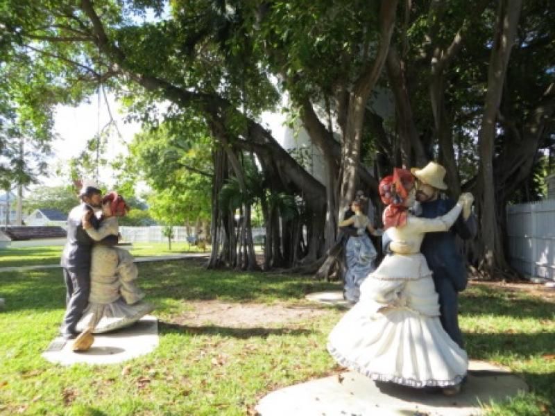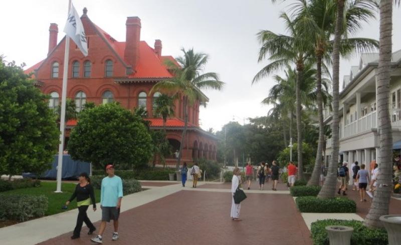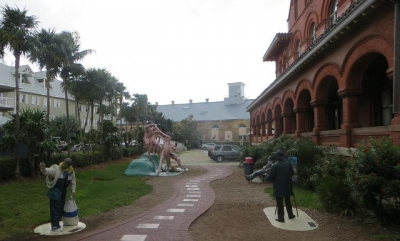 Zaten kahvaltımızı yaparken bir taraftan da şehrin meydanını ve marinasını seyredebiliyorduk. Geminin bağlandığı iskele; kasabanın meydanına, turistik alışveriş mağazalarına ve yat limanına 5 dakikalık yürüyüş mesafesinde yer alıyor. Limanın bu derece şehir içerisinde olmasının bir nedeni de Key West’in bu kıyısının derin olması, bu yüzden de buraların tarih boyunca kıymetli olmasının nedenlerinin başıdır. Limandan ayrılınca hemen karşımıza çıkan kırmızı 4 katlı bir bina dikkatimizi çekiyor. Burası gümrük, posta ve yerel mahkemelerin de içinde olduğu bir resmi daire… 1891 yılından beri hizmet veren bu binanın önünde bulunan heykellerin fotoğraflarını çekmeden yapamadım.