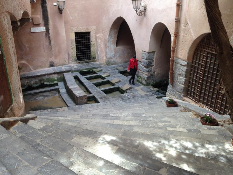 Caddeler çok dar ve genelde araba olmadığı için biz de tamamen gelişine sokaklara girip çıktık. Önümüze çıkan pasaj benzeri bir yer dikkatimizi çekti, burası tarihî bir çamaşırhane imiş. Bizim Anadolu'da da yunak dediğimize, kültürümüzdekine benziyor.