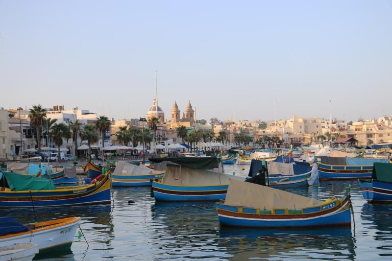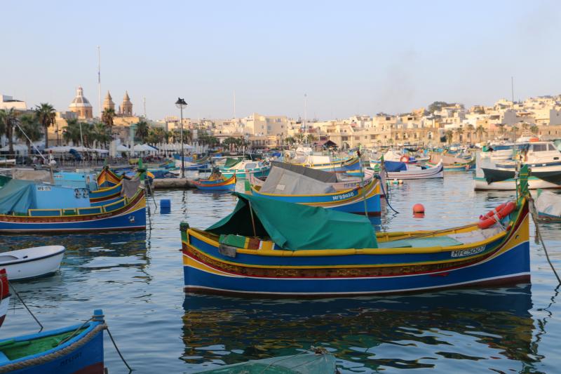 Marsaxlokk, Malta’nın güneyinde yer alan, geleneksel bir balıkçı köyü… Yine Valetta’dan otobüse binip, yol üzerindeki küçük yerleşim yerleri ve bahçelerin arasından geçerek, yarım saat içinde köye ulaşıyoruz. Sakin bir köy olan Marşaxlokk, Pazar günleri sahile kurulan, gıda ve tekstil pazarı nedeniyle oldukça kalabalık oluyormuş. Luzzu olarak bilinen, sarı, mavi, kırmızı, beyaz ve yeşilin canlı tonlarıyla boyanmış , ön taraflarına koruyucu olduğuna inanılan iki göz resmi çizilmiş tekneler köye renk katıyor. Bazıları turistik olarak kullanılsa da teknelerin çoğu balıkçılık için kullanılıyor.