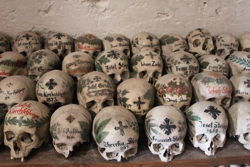 Sıradaki noktamız Kemikli Ev (Beinhaus)... Merdivenlerden çıkıp varıyoruz buraya. Kapıda biletimizi alıp içeri giriyoruz sonra geri toplanmak üzere orayı anlatan bir kağıt veriliyor. Sınırlı mezar alanı sebebiyle ölüler geçici olarak toprağa gömülür ve 10-15 yıl sonra kemikleri toplanıp güneşe beyazlamaları için bırakılırmış ve Beinhaus’ta dekoratif şekilde sergilenirmiş. Kafatasları üzerinde yer alan 4 değişik sembol bulunuyor ve aile adları yazıyor toplam 1200 adet kafatası var. 70’li yıllarda Katolik kilisesi ölülerin yakılmasını serbest bırakınca bu uygulama durdurulmuş.