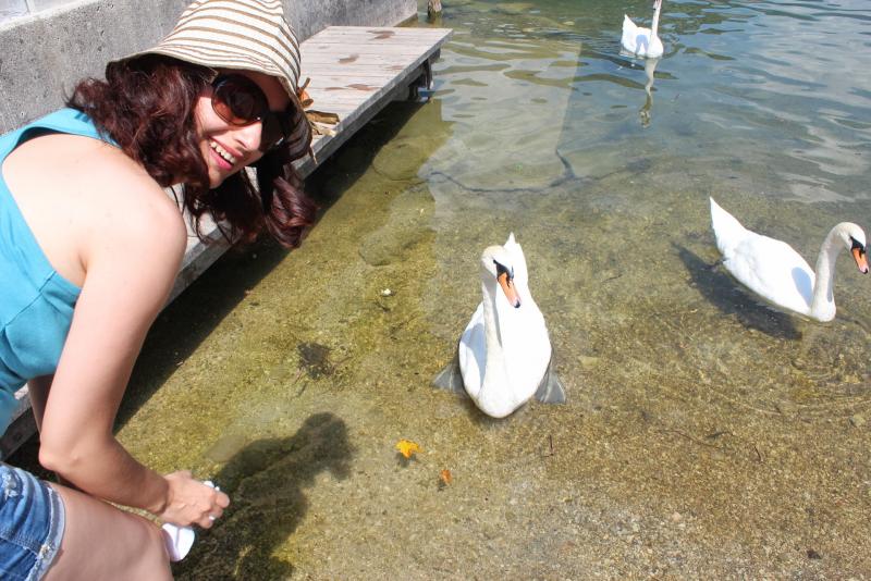 Mağaradan merkeze gelirken geçtiğimiz yolun sağ tarafı tamamen göl manzaralı. Fotoğraf çekimi için insanlar tahtadan yapılan korkuluklarda birbirini bekliyor. Göle girdik su serin. Kuğular yanımıza geldi. Allah'ım gerçekten cennetteyim sanırım!