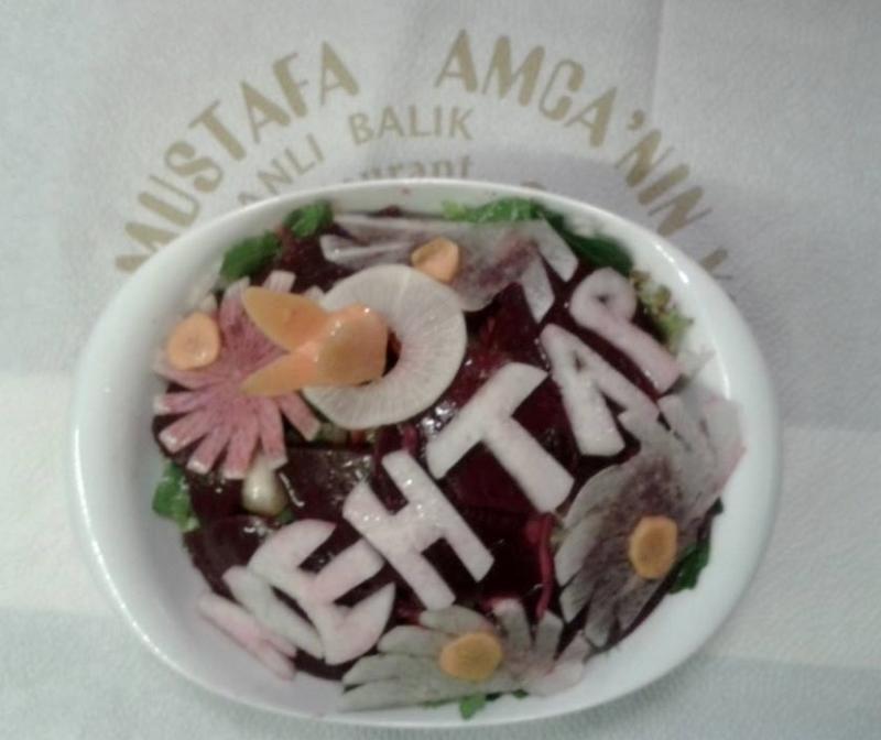 Akşam için Mustafa Amca'nın Yeri'nde rezervasyon yaptırmıştık. Burada yer bulmak zahmetli bir iş. Bu konu, işletme sahibiyle olan arkadaşlığından Sevgili Cenk'in göreviydi. Dolasıyla hiç zorlanmadık. Gecenin en güzel sürprizi şahsıma özel yapılmış salatam :) İçerisinde mevsimine göre değişen 24 çeşit malzeme var.