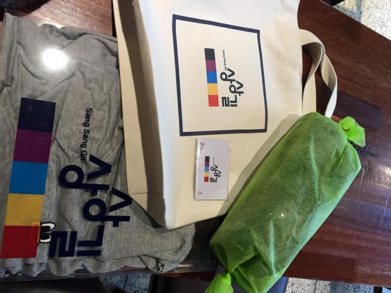 Meğer hediyeleri alacağımız yer de bir sanat platformuymuş. Sanat ile ilgili konuşmaya başlayınca baya laf lafı açtı. Yine bir ajumma ile aşk yaşadım... (Ajummalar bana bayılıyor nedenini hala çözemedim) :) Sonra geldiğime dair bir deftere adımı ülkemi yazdım. Hediyelerimi verip fotoğrafımı çektiler. Eski tip lastik ayakkabı malesef ayağıma uyanı yoktu. Bez çanta, Kore akbili (içinde 5.000 won para vardı), Pancoat tişört (bu Kore'deki baya ünlü bir marka üzerinde Imagine Your Korea logolu). Ben sadece 1 hediye verecekler sanıyordum. Elim kolum doldu yani =)