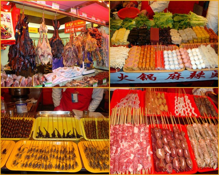 •Sırtı güneşe bakan herşeyi yiyorlar.. Bana enteresan gelenler kozası içinde kızartılmış ipek böceği, akrep (canlı canlı kızgın ateşe atılıyor, bir kız karşımızda yerken ağzından sarkan kuyruğu hala oynuyordu), şişe geçirilmiş kırkayak ve köpek beyni!