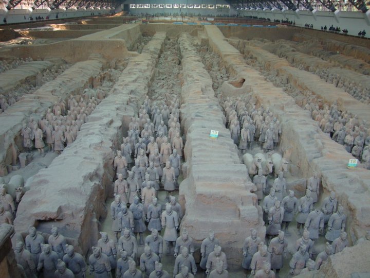 •Dünyanın son yıllardaki en önemli ve en görkemli arkeolojik keşiflerinden birisi Xian’daki Terracotta Savaşçıları. 39 yaşında ilk Çin imparatoru olan Shihuan kendisini öbür dünyada korumak için 8000 heykelden oluşan yer altı ordusu yaptırmış, biri diğerine benzemeyen bu terracota askerlerinin rütbeleri bile var. Askerler ellerinde bronz yaylar ve kargılarla, atlı savaş arabalarında zırhlı üniformaları ile yer alıyor. Tüm çukurlarda bulunan heykel sayısı 8000, bunların 6000‘i asker 2000‘i ise at heykeli. Kazılar hala devam ediyor.. Bu mezar ve heykeller 1987 yılında Unesco tarafından Dünya Kültür Mirasları listesine alınmış. Bu arada toprağı kazarken şans eseri askerleri bulan köylüyü de orada kitap imzalarken görebiliyorsunuz!