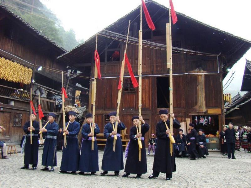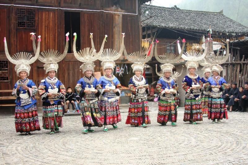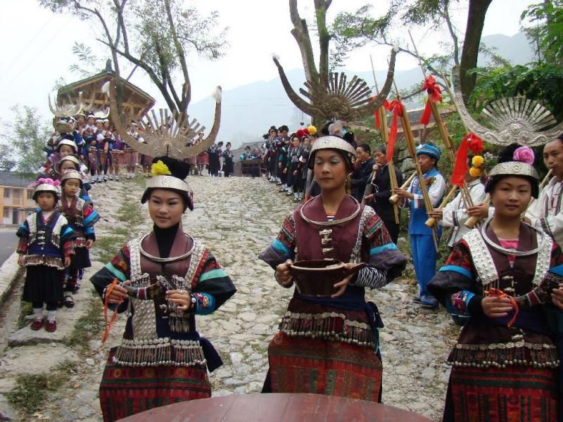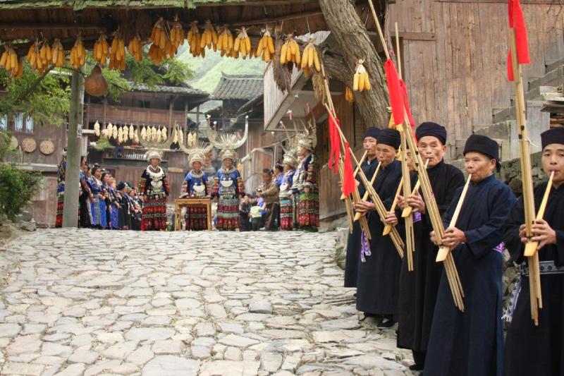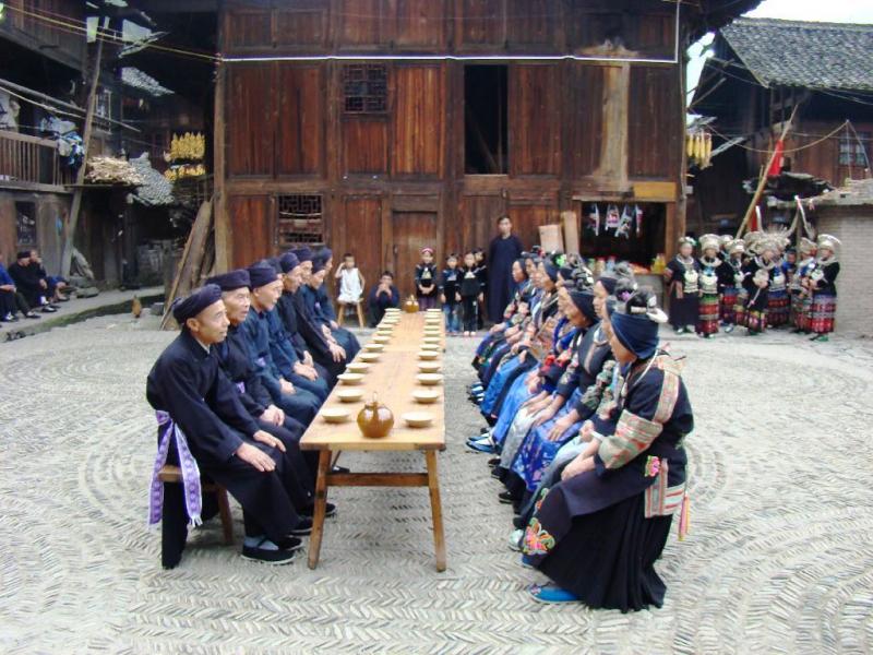 Bize sundukları pirinç şaraplarını çok sert de olsa içiyoruz, daha önce rehberimiz bizi uyarmıştı, kabul etmemek onlara hem hakaret hem de çok üzülürlermiş. “Uzun etekli” Miao kabilesinin kıyafetleri müthiş, zengin, renkli ve gösterişli. Sadece bu karşılama törenlerinde turistler için giydikleri, her bir kişinin üzerindeki gerçek gümüş takıların değeri 2-3 bin dolar. Köyün içlerine doğru ilerledikçe fakirliklerini fark etmemek mümkün değil, mısır ve pirinç gibi ekinlerle geçiniyorlar, bu tür turistik törenler oldukça da biraz para kazanıyorlar ama eminim kazancın çoğu acentelere gidiyordur. Tüm fakirliklerine rağmen yüzleri hep güleç olsa da derinlerine baktığınızda hüznü görmemek mümkün değil. Bu coşkulu karşılamadan, bizlerin ilgisiyle onlar da mutlu, ikramlar hiç bitmiyor. Kendimizi müthiş özel hissederek etrafımızı saran köylülerle birlikte köyün meydanına geldiğimizde bize bir de gösteri hazırladıklarını meydanın etrafına dizilmiş banklardan anlıyor ve yerlerimize yerleşip çoğunluğunu yaşlıların oluşturduğu grubu izlemeye koyuluyoruz.