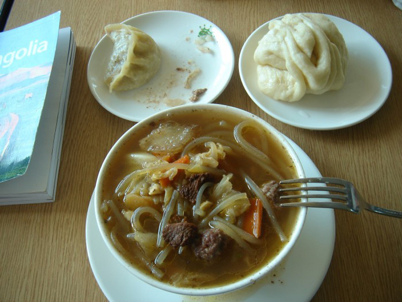 Ulan Bator'a vardığımda öncelikle bir restorana gidip Moğol yemekleriyle tanıştım. Ulan Bator'daki ilk yemeğim bol koyun etli, biraz makarna ve sebzeli sulu yemek (şölte khool). Burada koyun etini çok kullanıyorlar. Koyun etli mantıya "buuz" deniyor. Ekmek yerineyse genelde löp hamur (mantu) tüketiyorlar.